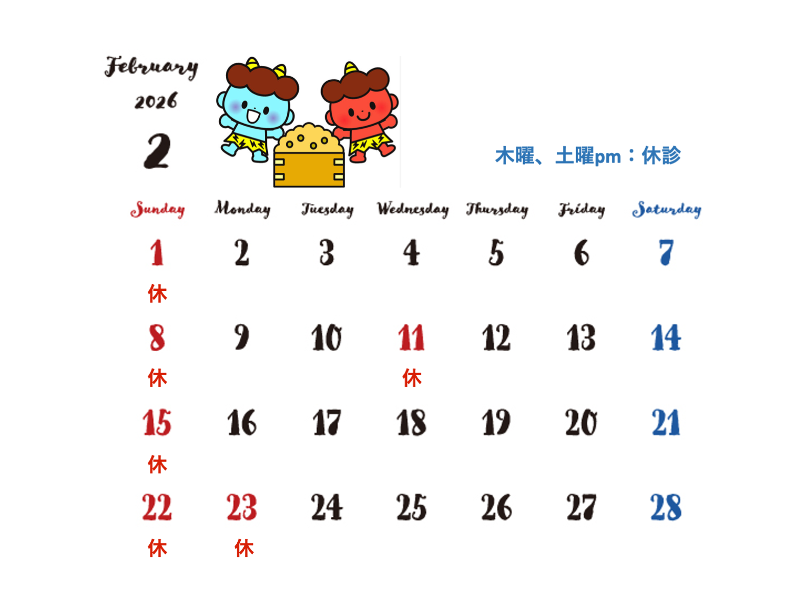 2月診療日のご案内 2026.02.16 新着情報 こんにちは。 村元内科クリニックです。 寒気の中にも早春の息吹が感じられる頃となりましたが、みなさまいかがお過ごしでしょうか。 2月休診日のご案内です。 日曜日・休日ならびに、木曜・土曜日の午後は休診となります。 皆様にはご不便をおかけしますが、どうぞよろしくお願いいたします。 時節柄、体調を崩しませんようどうぞお健やかにお過ごしください。 村元内科クリニック